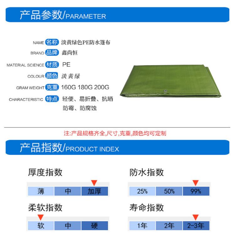 淡黃綠色PE防水篷布PE材質(zhì)雙面防水,面料升級,防雨不漏水,防曬抗老化,有效隔離水珠,做工精良使用壽命長,立體包邊加厚設(shè)計,編織密度高耐撕拉。