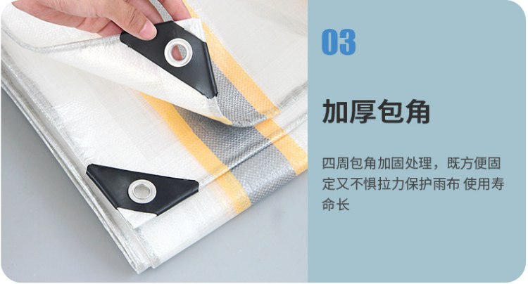 金包銀色PE防水篷布加厚包角:四周包角加固處理,既方便固定又不懼拉力保護雨布,使用壽命長。