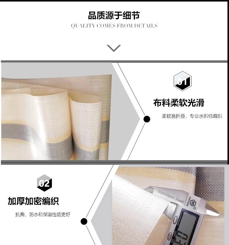 金包銀色PE防水篷布品質(zhì)源于細節(jié):布料柔軟光滑,柔軟易折疊,專業(yè)水織機編織;加厚加密編織,抗撕,防水和保溫性能更好。