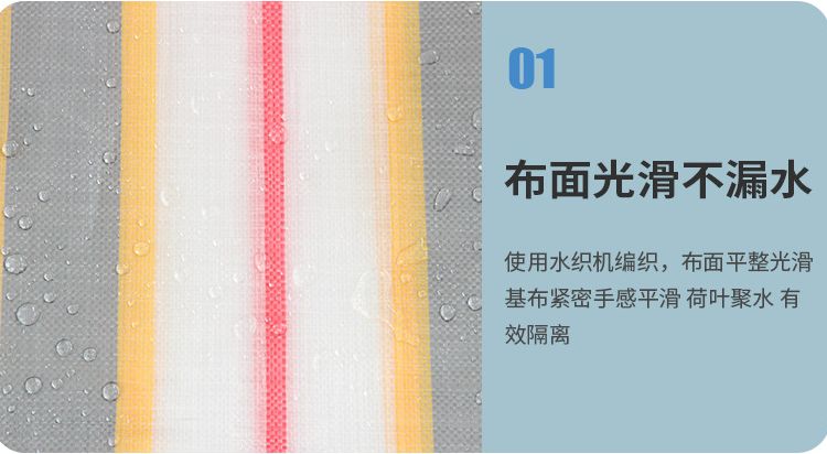金包銀色PE防水篷布布面光滑不漏水,使用水織機編織,布面平整光滑,基布緊密手感平滑,荷葉聚水,有效隔離。