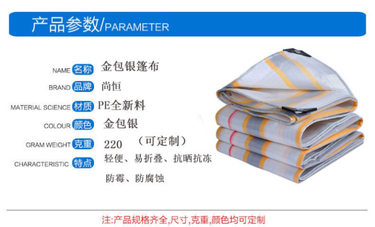 金包銀色PE防水篷布韌性好 易折疊:雨后不增重,易于晾干,使用壽命長,使用便捷。