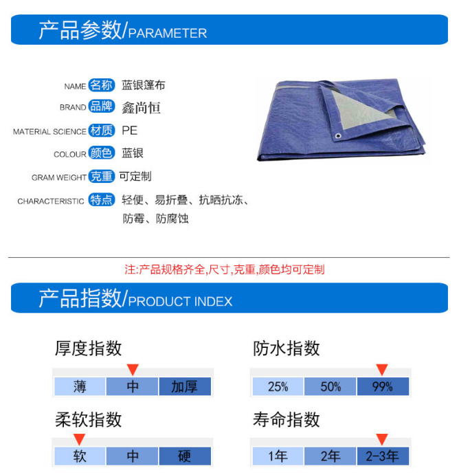 備注:克重70g-240gPE防水篷布都有加工定制,藍(lán)銀色PE防水篷布